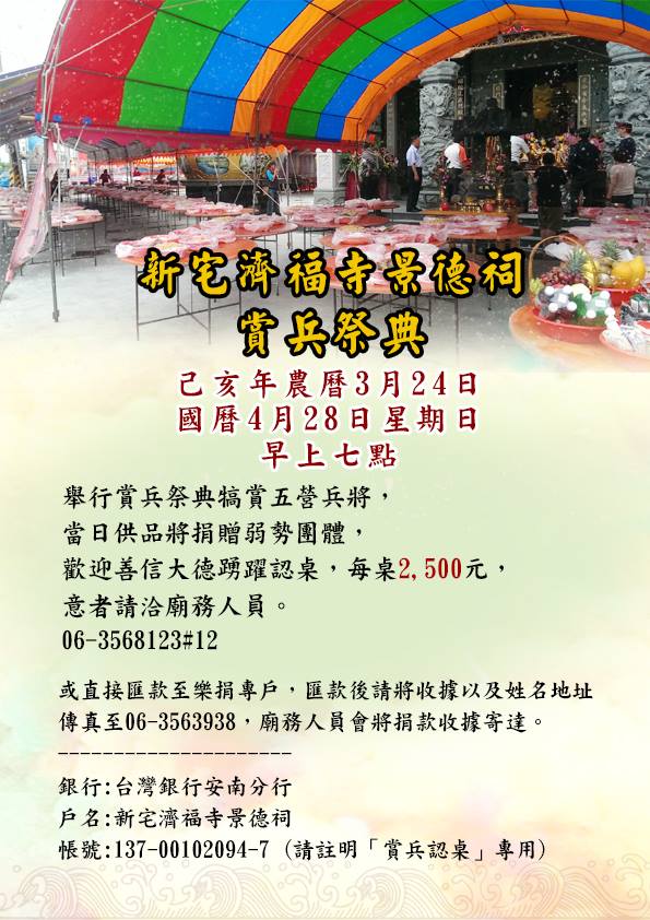 每桌2,500元,意者請洽廟務人員。06-3568123#12